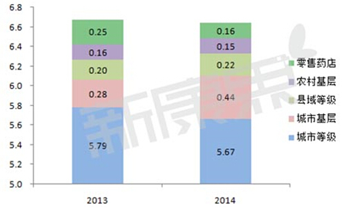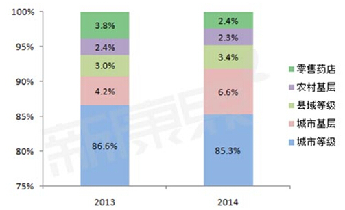 从各大终端来看,由于阿立哌唑制剂均为处方药,因此医院终端在整个市场中所占份额高达97%左右,并呈现上升的趋势。其中,城市等级医院的销售规模占整个市场的85%以上,2013年和2014年的销售额分别为5.79亿元和5.67亿元,分别占整个市场的86.6%和85.3%,占比略有下降;其次为城市基层医院,占比从2013年的4.2%上升为2014年的6.6%,增长速度最快。而县域等级医院、城市基层医院和零售药店的总体占比尚不足一成,且零售药店市场占比下降明显。