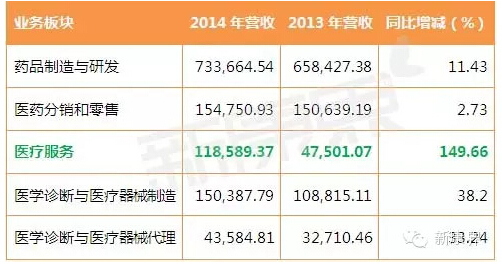 然而,其增长主要来源一是体量巨大的制造业务,但同比增长只有11.43%;二是医疗服务业务的收入增长,当年营收入11.86亿元,较2013年增长了1.5倍。若剔除医疗服务的爆发性增长,集团整体营收的同比增速将从20.3%骤降至13.2%。