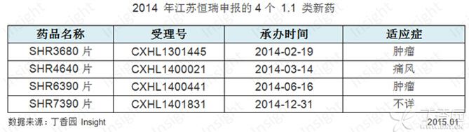 作为目前国内领先药品创新研发的江苏恒瑞,在过去的一年不仅收获了甲磺酸阿帕替尼的生产批件,也在这一年中申报了4 个1.1 类新药(见下表),第4 个申报的1.1 类新药SHR7390 更是抓住了2014 年的尾巴,受理号在最后一天被予承办进入审评中心。