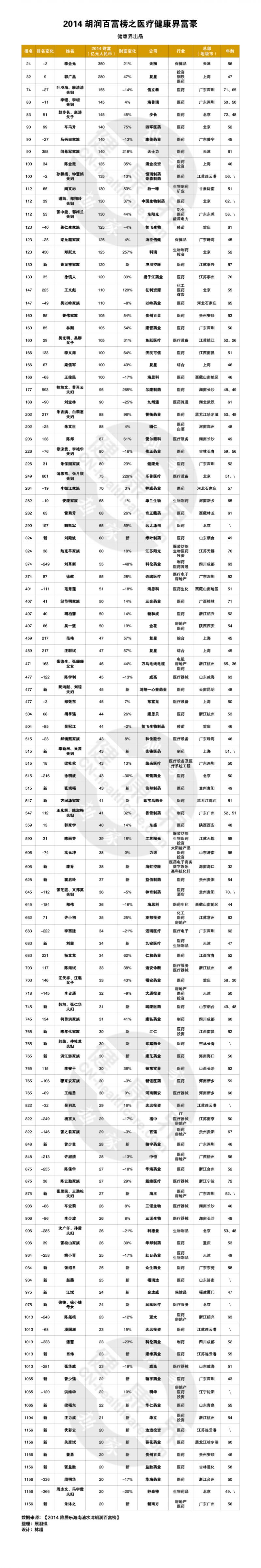 紧随李金元之后,胡润百富榜前100名涉足医疗健康领域的富豪还包括复星郭广昌,信立泰叶澄海、廖清清夫妇,海普瑞李锂、李坦夫妇,步长赵步长、赵涛父子,四环医药车冯升,康美药业马兴田家族,天士力闫希军家族,涌金投资陈金霞,恒瑞制药、豪森制药的孙飘扬、钟慧娟夫妇。