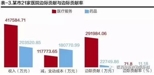 以边际贡献率为指标对华南某市21家公立医院的财务数据进行分析(见表-3),计算医疗服务和药品的边际贡献率。该市尚未开展取消药品加成政策相关改革,医院药品仍然实行在采购价基础上顺加15%的政策。不难发现,医疗服务的边际贡献率为71.80%,而药品的边际贡献率仅为11.18%,两者相差较大,一方面提示医院卖药在经济上是不划算的,以药补医违背经济规律,另一方面提示如果降低药品成本、提高医疗服务价格,可以做到保持医院收入不变,而收益倍增。