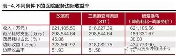 最后,我们测算了改革前和不同改革方式条件下医院的边际收益率,印证了腾笼换鸟式改革的合理性。(表-4)