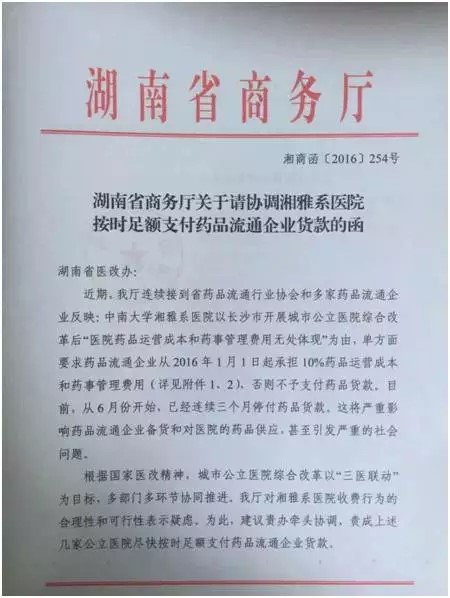那么现在情况怎么样了呢?据《看医界》获悉,湖南省商务厅近日给湖南省医改办发函,称湖南几家大医院以“医院药品运营成本和药事管理费用无处体现” 为由,从六月份开始,已经连续三个月停止支付药品货款。