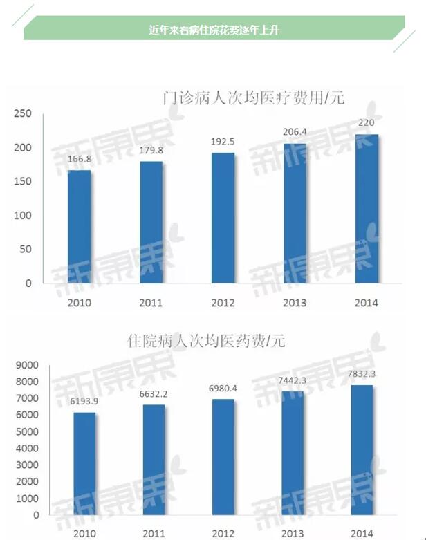 近年来看病是越来越贵,要是只是头疼脑热的小病,看个门诊也就行了,那么问题不是很大,门诊病人次均花费从2010年的166.8元增长到2014年的220元。但是如果一不小心住了院,那么问题就比较严重了,统计显示每次住院平均需要的花费从2010年的6193.9元增长到2014年的7832.3元。