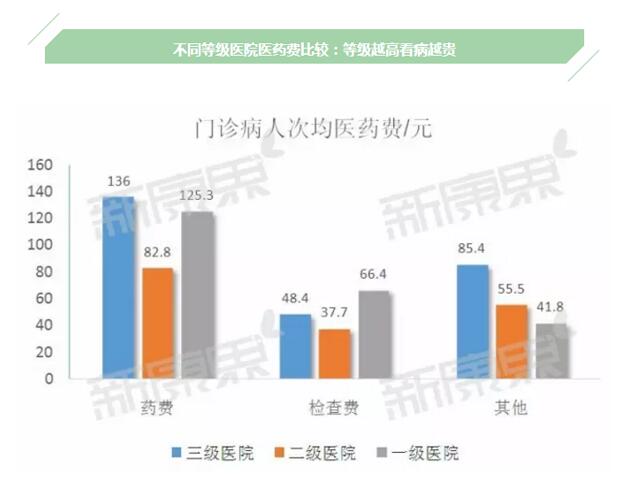 在中国医院是分为不同等级的,当然是越好的医院收费越高了,在门诊费用方面区别不是很明显,毕竟门诊都是看的头痛脑热的小病,或者只是做初步的治疗,花费不高,区别不是很明显。但是不同级别的住院病人费用区别十分明显:2014年住院病人在一级医院看病每次需要3737.1元,二级医院每次看病增长到5114.6元,而到三级医院更是翻了一番还多,达到12100.0元,这本是无可厚非,大病、重病当然是要去好的医院,花费自然也就多了,但是也从一个侧面反映了中国医疗资源的分布不均匀。