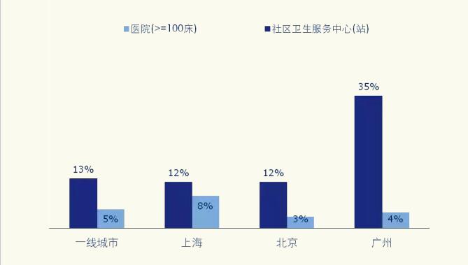 从一线城市看,社区药品销售额约为医院药品销售额的15%。上海和北京的2015年增长率为12%,而广州达到34%,这主要受益于广州从2014年6月份全面推行“基层首诊”与“双向转诊”制度,其通过拉大不同等级医疗机构的医保支付比例鼓励了基层首诊。