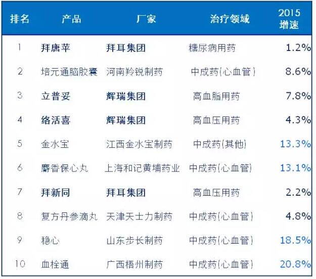 从治疗领域看,一线城市社区用药主要为中成药(以中枢性脑血管,强心药,骨骼肌肉用药为主),高血压,糖尿病和高血脂慢病用药为主,这四大治疗领域约占社区用药销售额的75%,2015年增速均超过12%,远高于医院增速。