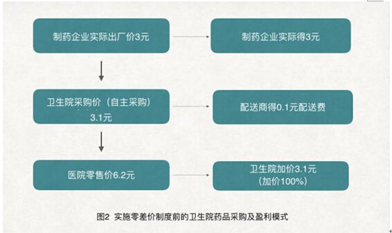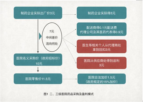 而二三级医院之所以偏好以高批发价采购药品,很大部分原因在于15%的加价率管制政策的实施,即医院药品的零售价格最高只能在采购价的基础上增加15%。因此,为了增加利润,医院自然偏好采购高价药。原来采购价3元的药,医院卖6元,赚3元。实行15%加价管制政策后,同样的药品,医院加价0.45元,如果将采购价抬高到10元,同样的药品,医院就可以加价1.5元,合法的利润就增加了1.05元。此外,医院和医生再通过返点和回扣拿到6元的药品收益。