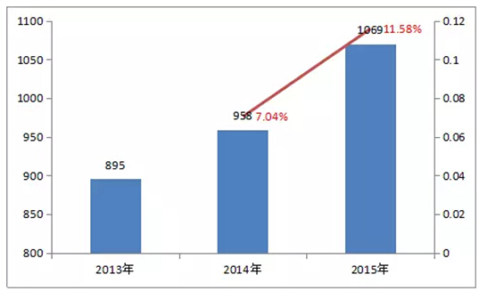 2013-2015年零售药店处方药市场规模及增长(亿元)