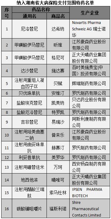 为切实减轻参保(合)大病、罕见病患者使用高值药品(以下简称特药)费用负担,根据《湖南省城乡居民大病保险实施方案》(湘政办发〔2015〕92号)精神,按照公开公正、基本保障、渐进稳妥、部门联动的原则,经专家评审、价格谈判、结果公示等程序,现将“尼洛替尼”等16种特药纳入湖南省大病保险支付范围(见附件)。参保人员在定点机构购买上述药品,以及异地发生符合报销规定的药品费用纳入大病保险支付。