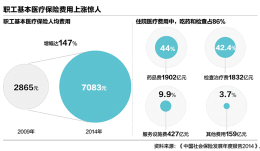 《中国社会保险发展年度报告2014》也显示,2014年,职工基本医疗保险人均费用为7083亿元,比上年增长15.2%,比2009年增加4218亿元,增幅达147%。