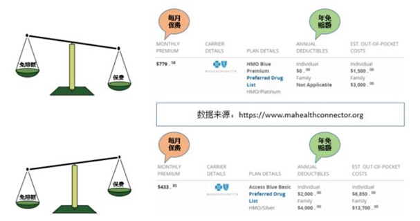 以医保交易所 (Health Exchange) 2016年波士顿地区的医保为例(参见下图),同为保险公司Blue Cross Blue Shield of Massachusetts的商业医疗保险计划,年免赔额为0的医保(个人)每月保费高达779.58美元,而年免赔额为2,000美元的医保(个人)每月保费为433.85美元,约为零免赔额医保的一半。和零免赔额医保相比,这款高免赔额医保一年可以可省下保费4,149美元,远高于2,000的年免赔额。从这个例子可以看出,对于不需要常常看病吃药的参保人来说,选择高免赔额医疗保险其实更划算。