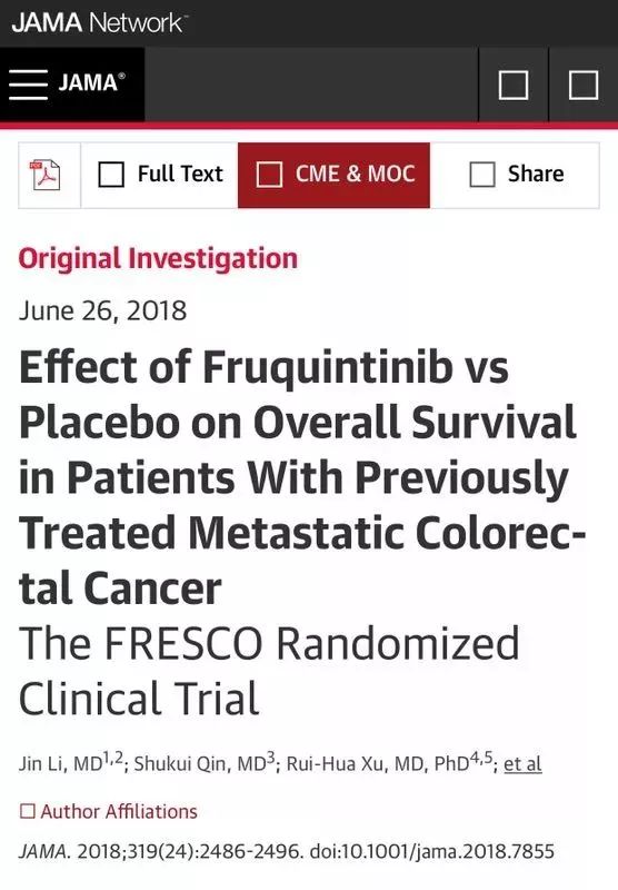 由和记黄埔公司申办、国内著名肿瘤学专家李进教授、秦叔逵教授、徐瑞华教授等担纲、国内二十多家肿瘤研究中心参与的呋喹替尼三期临床试验FRESCO的结果被国际顶尖刊物JAMA接纳并于6月26日公开发表,这个中国抗肿瘤新药领域属于“前无古人”创举。