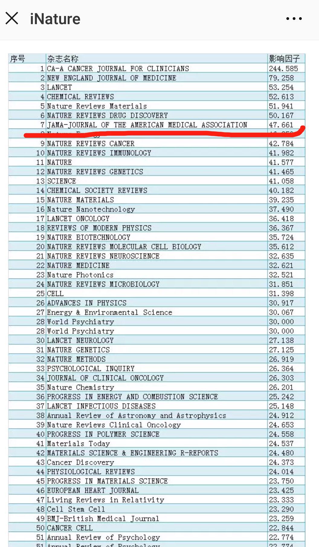 * JAMA目前在科学领域排名第七,影响因子:47.661