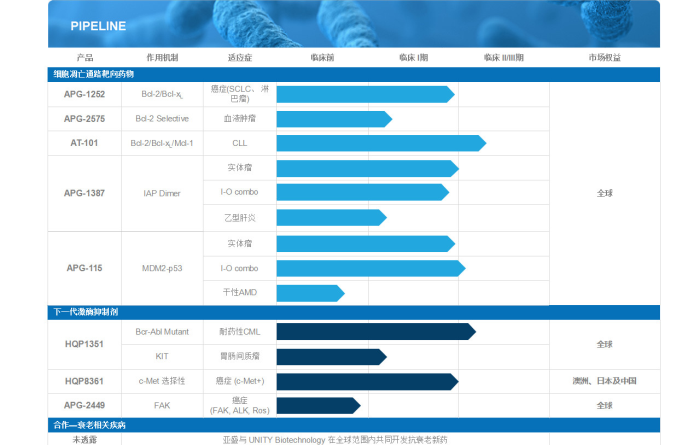 APG-2575也是一款新型药物,能选择性抑制Bcl-2,有望治疗由这种蛋白过量表达引起的恶性血液疾病。在临床前试验中,这款新药无论是单独使用,还是与BTK抑制剂、抗CD20单克隆抗体、以及PI3K抑制剂等其他类别的药物联合使用,都能对多种B细胞恶性肿瘤产生抗肿瘤活性。今年7月,亚盛在中国递交了APG-2575的临床试验申请。