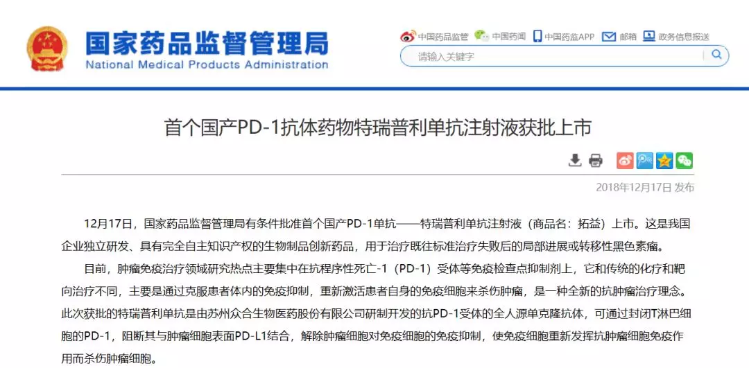 12月17日,君实生物「特瑞普利单抗注射液」的上市申请( CXSS1800006)正式获得国家药品监督管理局(NMPA)批准,用于治疗既往接受全身系统治疗失败后的不可切除或转移性黑色素瘤患者,中文商品名为拓益。从3月8日递交上市申请,到今天以优先审评方式获批,第一家国产PD-1的中国上市审批过程历时284天。