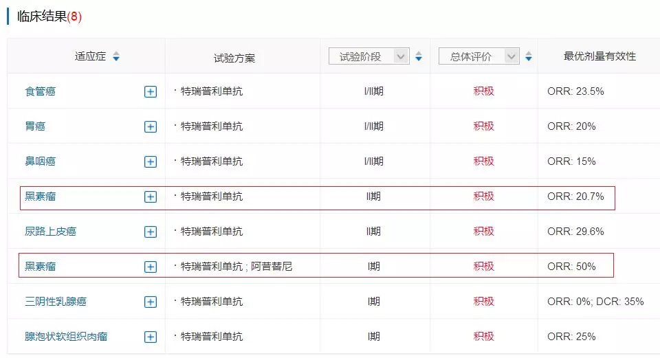 一项II期研究(NCT03013101 )数据显示,「特瑞普利单抗注射液」单药在晚期黑色素瘤患者中的客观反应率(ORR)达到20.7%,疾病控制率(DCR)60.3%。另外一项小型I期研究(NCT03086174 )显示,特瑞普利单抗与阿昔替尼联用,在转移性黏膜黑色素瘤中的有效率可以达到50%。