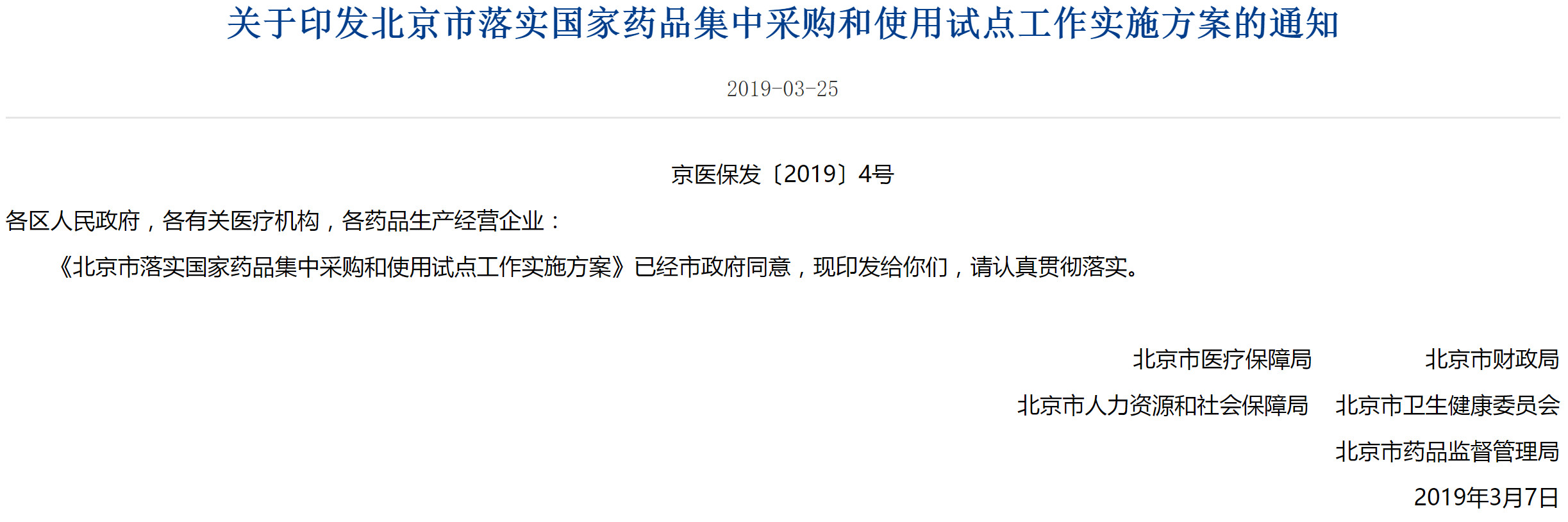 《关于印发北京市落实国家药品集中采购和使用试点工作实施方案的通知》