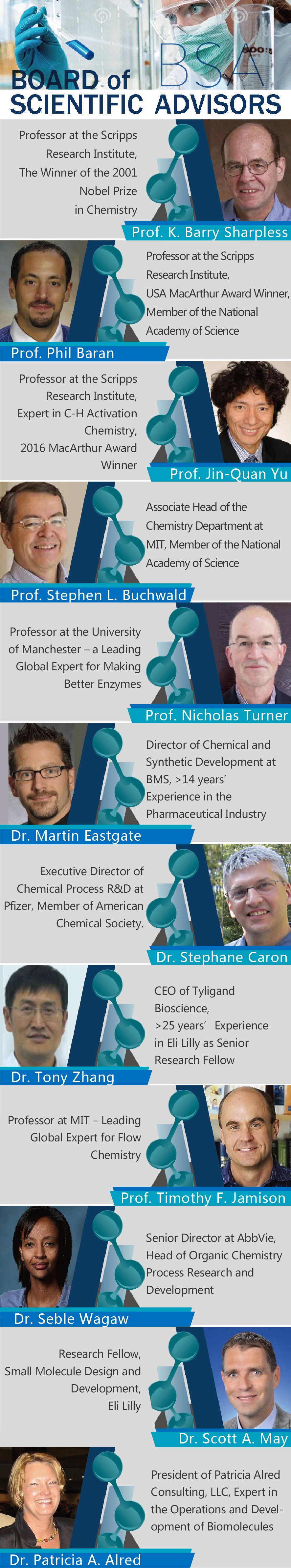 凯莱英凯莱英技术顾问委员会(BSA)成立于2013年6月,目前由12位行业内杰出科学家组成。BSA旨在为公司发展提供全球一流的技术指导,参与公司研发项目的立项、评审和鉴定验收,提出研究、开发、推广、应用先进技术的建议,组织并指导相关技术人员开展技术攻关,进一步推动公司向国际最前沿制药技术顶峰迈进。该委员会对运用具备完全自主知识产权的绿色制药技术,开发高端产品,占据国际国内市场,引领国内生物医药产业新的发展方向,具有重要推动作用。