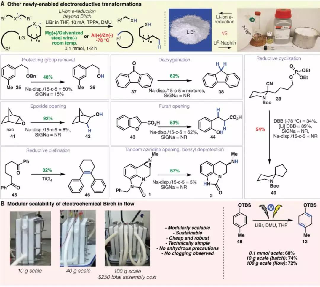 联合研发团队的科学家们在锂离子电池技术原理的基础上展开了一系列的研究工作,成功开发了一种安全可放大的电还原Birch反应。该反应不仅避免使用高危性碱金属钠和大量的氨,而且选择性高,底物适应性好,反应条件同样适用于其他重要反应,如环氧化合物/氮杂丙烷的开环反应、McMurry耦合反应等,并证明了其实用性、安全性、可扩展性以及化学选择性。