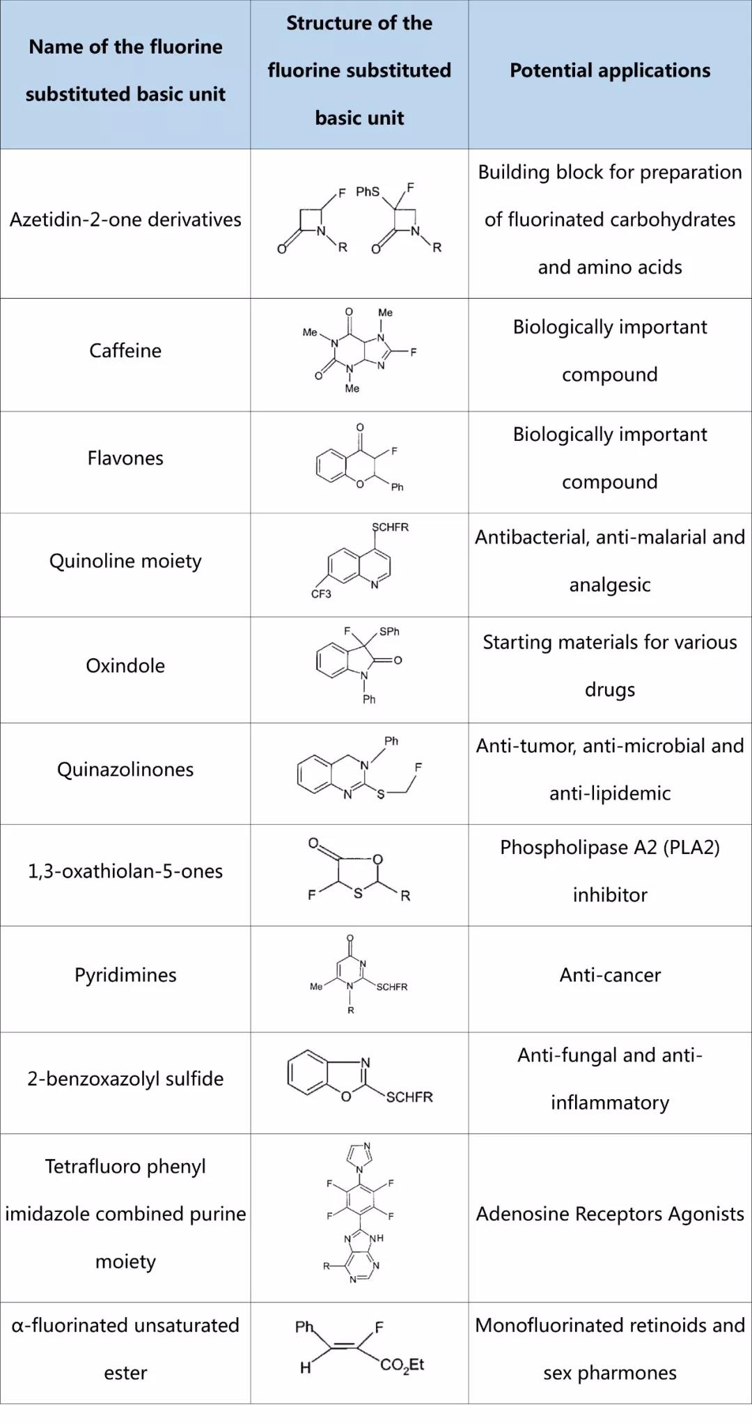 表1. 电化学合成氟有机化合物及其在药物中的潜在应用