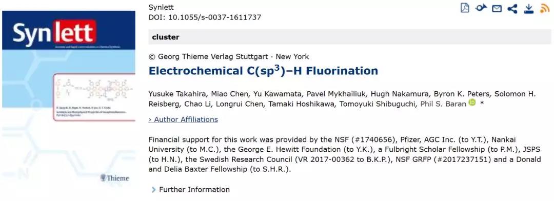 近日,凯莱英医药集团(股票代码:002821.SZ;以下简称“凯莱英”)研发论文——电化学C(sp3)-H氟化(Electrochemical C(sp3)–H Fluorination)在自然科学领域学术期刊《Synlett》获得发表。该项成果由美国斯克利普斯研究所Phil S. Baran教授课题组(Prof. Baran Group at The Scripps Research Institute)、基辅大学(University of Kyiv)、凯莱英绿色制药技术国际联合实验室(International Green Chemistry Collaboration Laboratory)和爱思股份有限公司(Eisi Co. Ltd)共同研究取得。