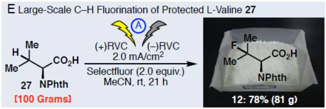 该电化学C-H氧化碳氟化反应实现了100g规模对邻苯二甲酸酐保护的L-缬氨酸的C-H氟化,获得78%收率和96%ee值(图3)。该合成方法进一步表明电化学C-H氟化反应具有稳定放大可行性和合成便捷性。通过电化学构筑新的官能团在有机合成领域开辟了一个新的研究方向。