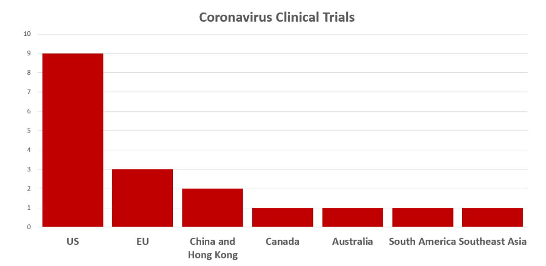 全球冠状病毒临床试验分布,截至2019年底新冠危机爆发前(Source: NLM)