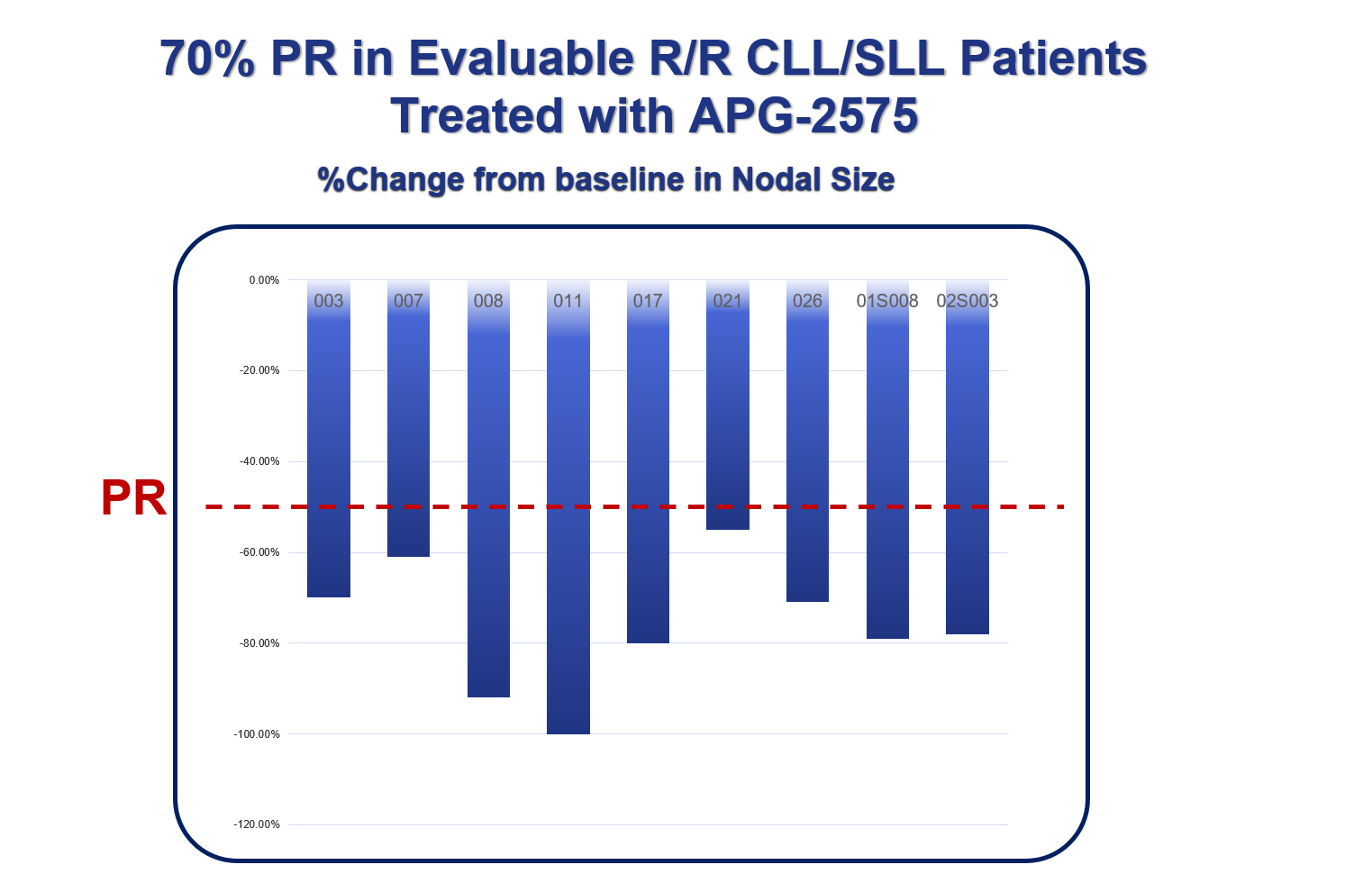 2020年12月,公司已公布APG-2575的最新临床进展:针对复发/难治CLL的临床研究已入组30多位患者,初步临床研究结果显示,在可评估患者中的客观缓解率(ORR)达到70%。这一数据非常令人振奋。在本次摩根大通会议上,杨大俊博士进一步展示了相关数据。