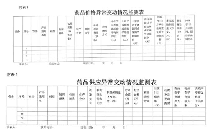 根据国家局通知的要求,各地对于常规监测发现价格和供应出现异常变动的药品,应按照省级药品集中釆购平台《药品价格异常变动情况监测表》和《药品供应异常变动情况监测表》每月报送信息。 各地对于重点监测的药品,无论价格或供应是否出现异常变动,每季度按附表1、附表2的信息需求报送监测结果。