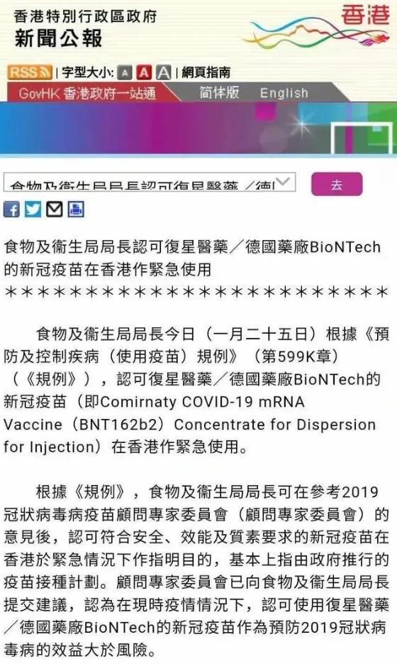 根据此前公开报道,该款疫苗在中国大陆及港澳台地区权益为复星医药独家所有。2021年上半年,该疫苗已获得中国香港紧急使用认可和中国澳门的特别许可进口批准,并已投入中国香港和澳门地区的政府接种计划。