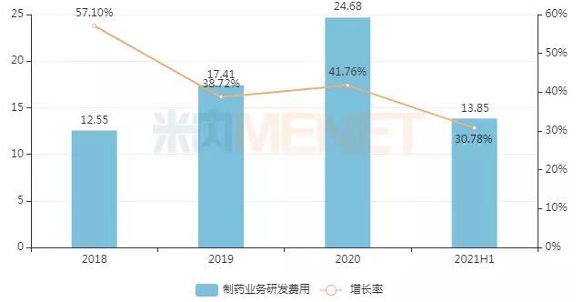 2021年上半年,复星医药制药业务研发投入17.77亿元,同比增长15.31%,制药业务研发投入占制药业务收入的14.51%。其中,研发费用为13.85亿元,同比增加3.26亿元、增长30.78%,占制药业务收入的11.31%。