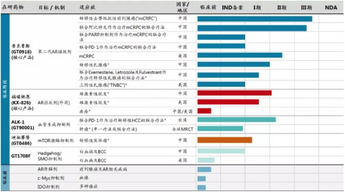 开拓药业核心瞄准的是前列腺癌、乳腺癌、肝癌和脱发治疗,以AR相关疾病为核心。研发进度方面,共有5种在研药物进入临床阶段,其中进度最快的是普克鲁胺。