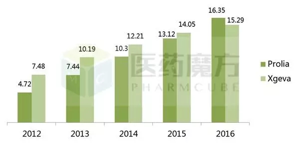 抗核因子kB受体活化因子配基(RANKL)单抗的原研药是Amgen的狄诺塞单抗(denosumab),用于治疗骨质疏松(商品名Prolia)、实体瘤骨转移和骨细胞瘤(商品名Xgeva),2016年合计为Amgen贡献了31.64亿美元。