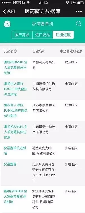 国内共有7家公司申报RANKL单抗药物,齐鲁制药是国内企业中最早申报的一家,已经获批临床。