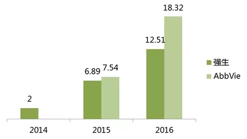 Imbruvica(依鲁替尼)是全球首个上市的BTK抑制剂,市场表现惊人。目前由强生负责美国以外市场的销售,AbbVie负责美国市场的销售,并可从强生获得销售分成。2016年的全球销售额合计达到30.83亿美元。