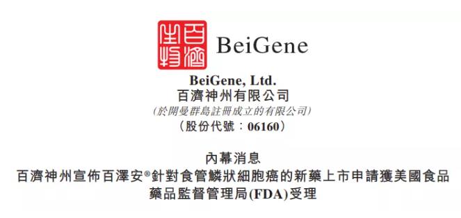 9 月 13 日,百济神州宣布,美国食品药品监督管理局(FDA)已受理其抗 PD-1 抗体药物百泽安®(替雷利珠单抗注射液)的新药上市申请(BLA),用于治疗既往经系统治疗后不可切除、复发性局部晚期或转移性食管鳞状细胞癌(ESCC)患者。根据《处方药使用者付费法案》(PDUFA),FDA 对百泽安®上市申请做出决议的目标日期为 2022 年 7 月 12 日。