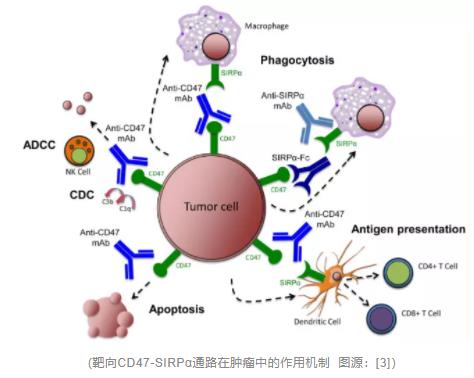 SIRPα即信号调节蛋白 Signal Regulatory Protein Alpha,主要表达在髓系造血细胞如巨噬细胞、单核细胞、树突状细胞和粒细胞表面。CD47(白细胞表面抗原,Leukocyte surface antigen)是SIRPα的配体之一,在正常成人组织中分布非常广泛,参与多种调节作用。CD47与SIRPα结合可以阻止未成熟的树突细胞成熟并抑制成熟树突细胞产生细胞因子。正常情况下,CD47-SIRPα通路向免疫系统释放“别吃我”信号,可以起到阻止巨噬细胞吞噬正常细胞的作用,但这一机制被癌细胞利用时,癌细胞可以借此逃过免疫系统的监视。因此阻断SIRPα或CD47可激活巨噬细胞对肿瘤细胞的杀伤作用。使得CD47-SIRPα抗体开发成为治疗肿瘤的一种思路。