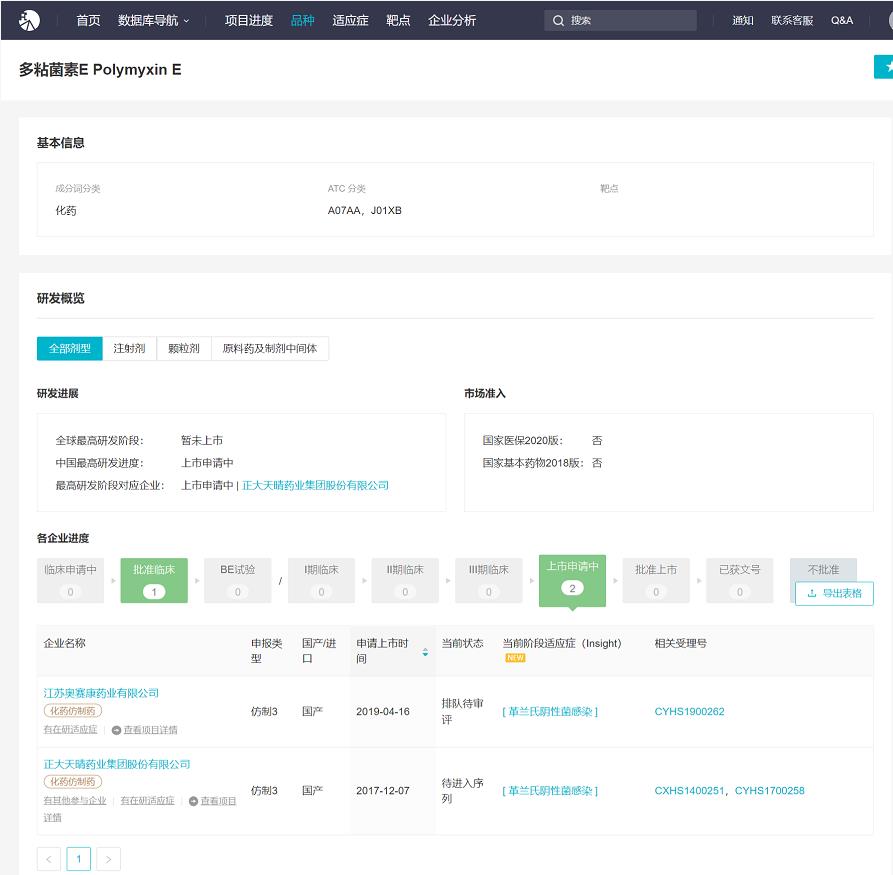 正大天晴的注射用多黏菌素 E 甲磺酸钠是联合上海医药工业研究院开发,曾于 2014 年递交过一次上市申请,但后来在临床试验数据自查核查中撤回该申请。