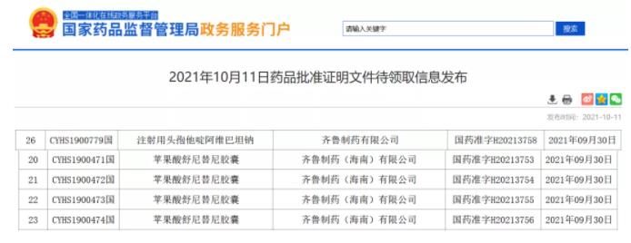 10月11日,国家药监局发布多个药品批件其中,齐鲁制药的注射用头孢他啶阿维巴坦钠、苹果酸舒尼替尼胶囊位列其中。