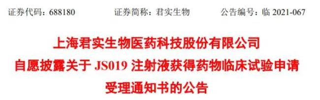 [1]上海君实生物医药科技股份有限公司自愿披露关于 JS019 注射液获得药物临床试验申请受理通知书的公告. Retrieved Oct 21,2021, from https://pdf.dfcfw.com/pdf/H2_AN202110211524129828_1.pdf?1634835924000.pdf