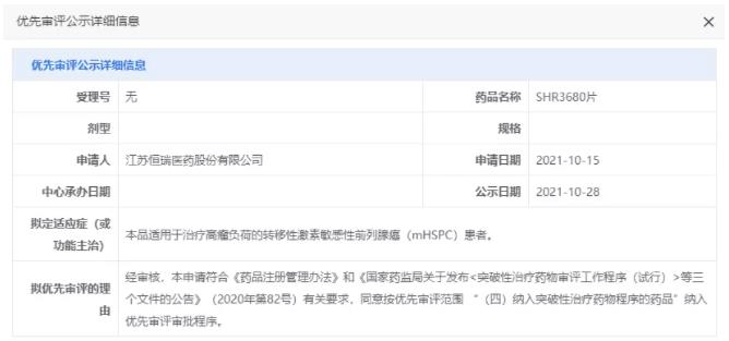 刚刚,CDE 官网显示,恒瑞二代 AR 拮抗剂 SHR3680 已经申报上市,拟纳入优先审评审批,用于高瘤负荷的转移性激素敏感性前列腺癌(mHSPC)患者。
