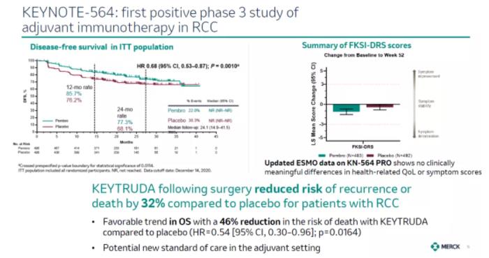 今日,默沙东(MSD)宣布,美国FDA已经批准其重磅PD-1抑制剂Keytruda作为辅助疗法,在手术治疗之后,治疗早期肾细胞癌患者。这些患者具有中高度或高度疾病复发风险。新闻稿指出,这是首款获得FDA批准辅助治疗肾细胞癌的免疫疗法,有望改变这些患者的标准治疗模式。