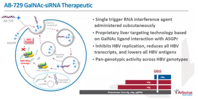 作为一种靶向肝细胞的RNAi药物,AB-729采用了Arbutus公司开发的新型共价偶联N-乙酰半乳糖胺(GalNAc)递送技术,能够皮下注射。在临床前模型中,AB-729可以抑制HBV病毒复制,减少所有病毒RNA转录副本,并降低所有HBV抗原,包括乙型肝炎表面抗原(HBsAg),在所有HBV基因型中显示出泛基因型活性。