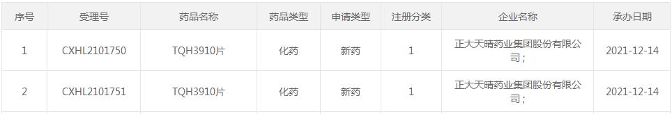 12月14日,正大天晴药业以新药1类提交的TQH3910片临床申请获得CDE承办受理,受理号为CXHL2101750、CXHL2101751。