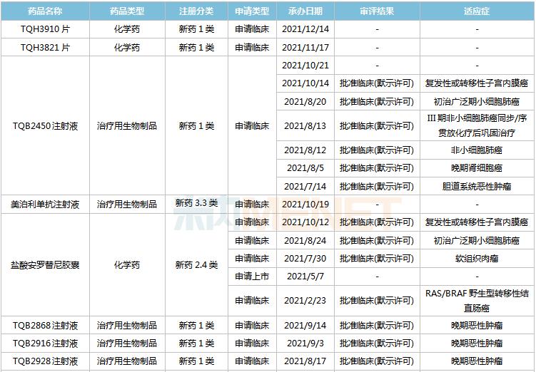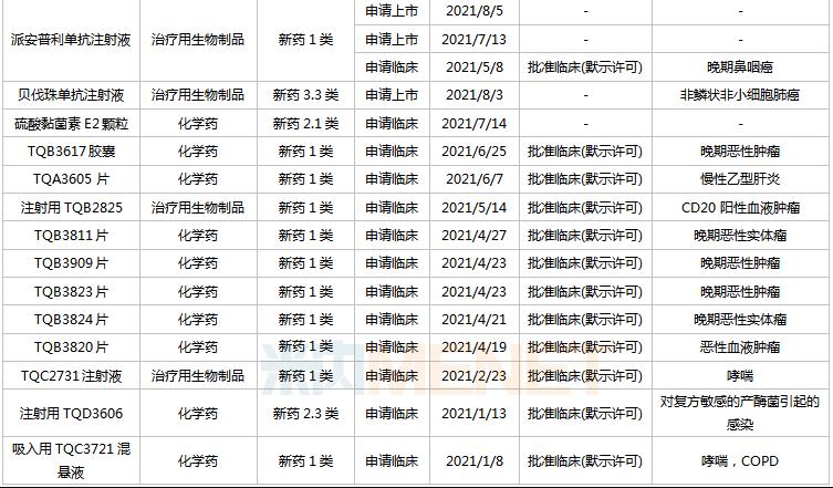 15款1类新药首次在国内申报临床,其中13款已获批临床,TQB3617胶囊、TQA3605片、注射用TQB2825、TQB3811片、TQB3909片、TQB3823片、TQB3824片、TQB3820片、TQC2731注射液、吸入用TQC3721混悬液已启动临床,目前均处于I期临床试验阶段。