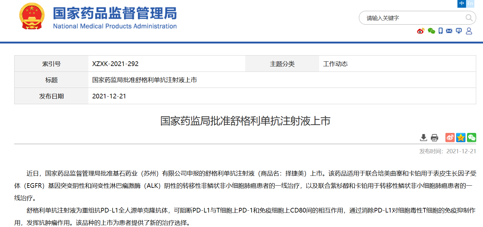 12月21日,国家药监局官网显示基石药业PD-L1单抗舒格利单抗上市申请(受理号:CXSS2000056)获NMPA批准。联合化疗,一线治疗晚期(IV期)鳞状和非鳞状非小细胞肺癌(NSCLC)患者,这是国内获批的第2款国产PD-L1单抗。