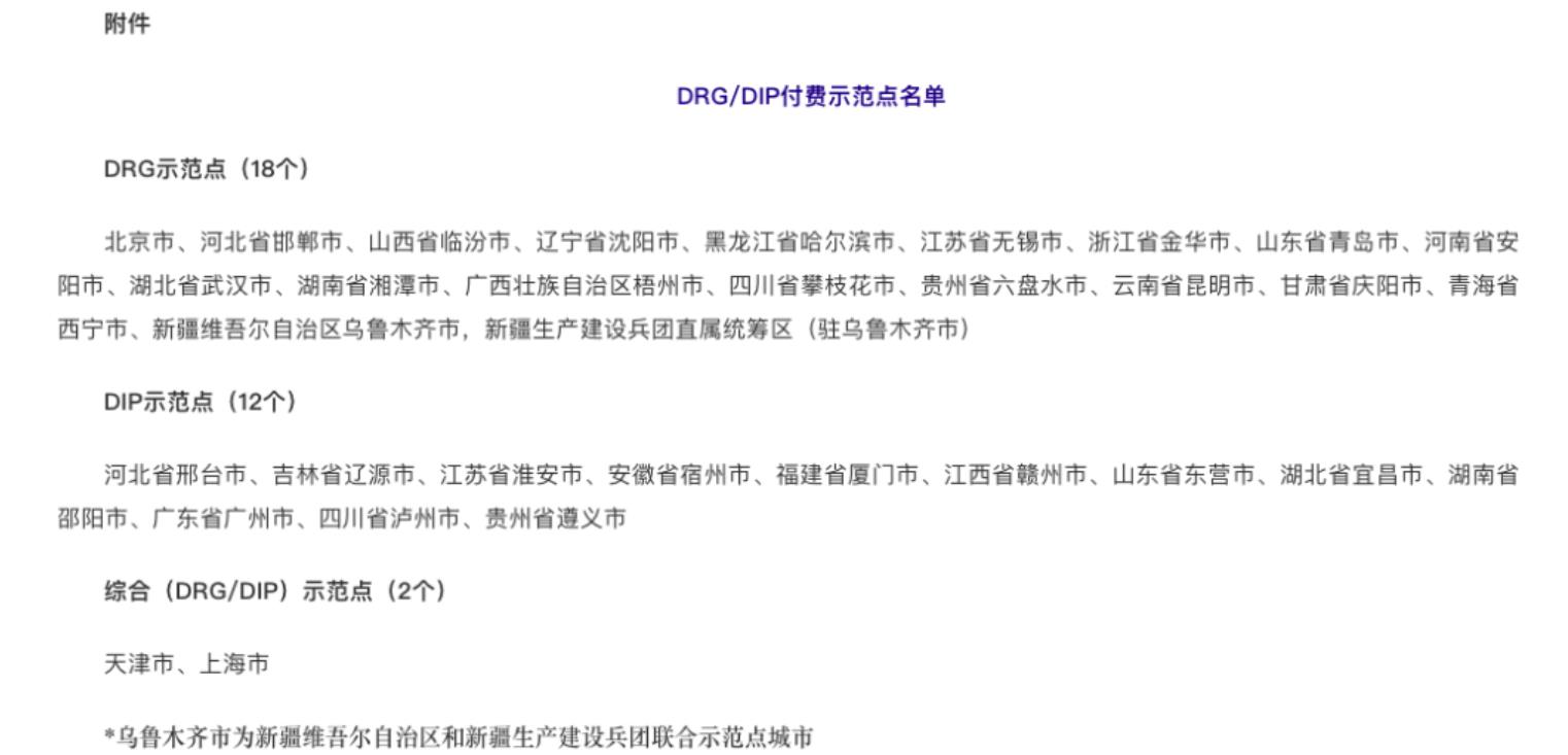 在本次大会前一天,12月17日,国家医保局办公室发布《关于印发DRG/DIP付费示范点名单的通知》指出,本次印发DRG/DIP付费示范点名单并指导后续扎实做好示范点建设工作,是推进医保支付方式改革向纵深发展的重要步骤,这些试点城市有望在提升医保治理现代化水平上发挥示范引领作用。纳入DRG/DIP付费示范点名单的城市有DRG示范点18个,DIP示范点12个,综合(DRG/DIP)示范点2个。