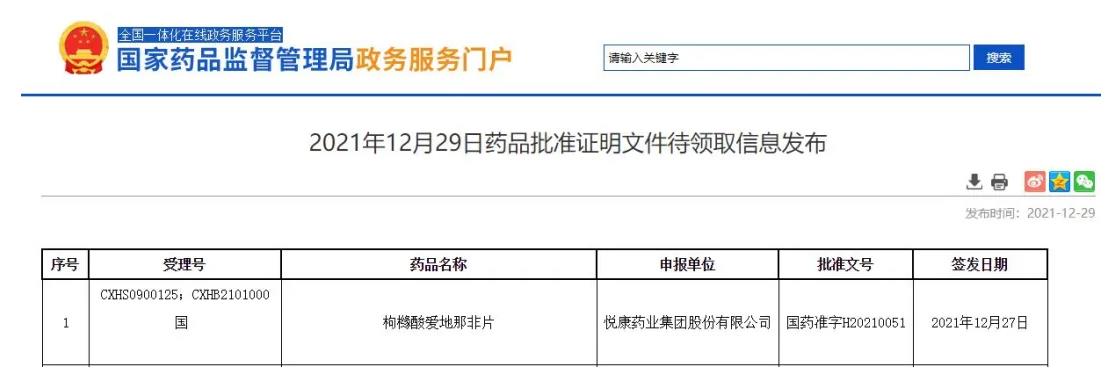 [1]中国国家药监局12月29日药品批准证明文件待领取信息. Retrieved Dec 29,2021, from https://www.nmpa.gov.cn/zwfw/sdxx/sdxxyp/yppjfb/20211229091120175.html