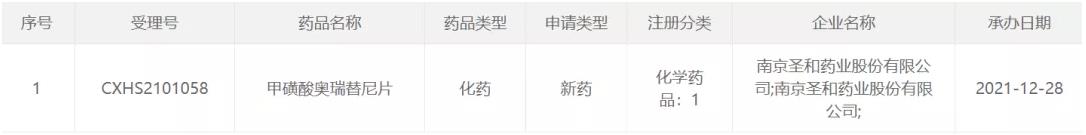 12月28日,中国国家药品监督管理局药品审评中心(CDE)公示显示,圣和药业已在中国递交1类新药甲磺酸奥瑞替尼片的上市申请,并获得受理。公开资料显示,甲磺酸奥瑞替尼是圣和药业自主研发的第三代EGFR-TKI。